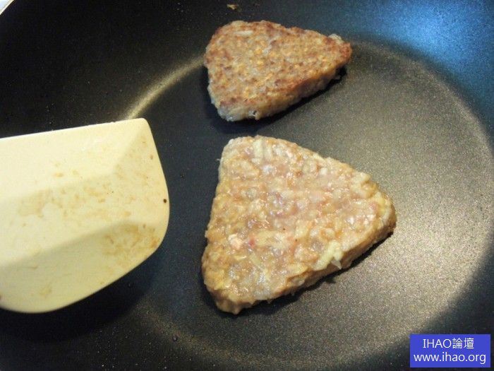 4鍋熱,下少少油。用湯匙挖ㄧ大塊步驟3的材料進煎鍋,左手拿煎匙,右手拿湯匙,幫材料整成三角形或你喜歡的形狀。煎到ㄧ面金黃,再翻面煎到金黃