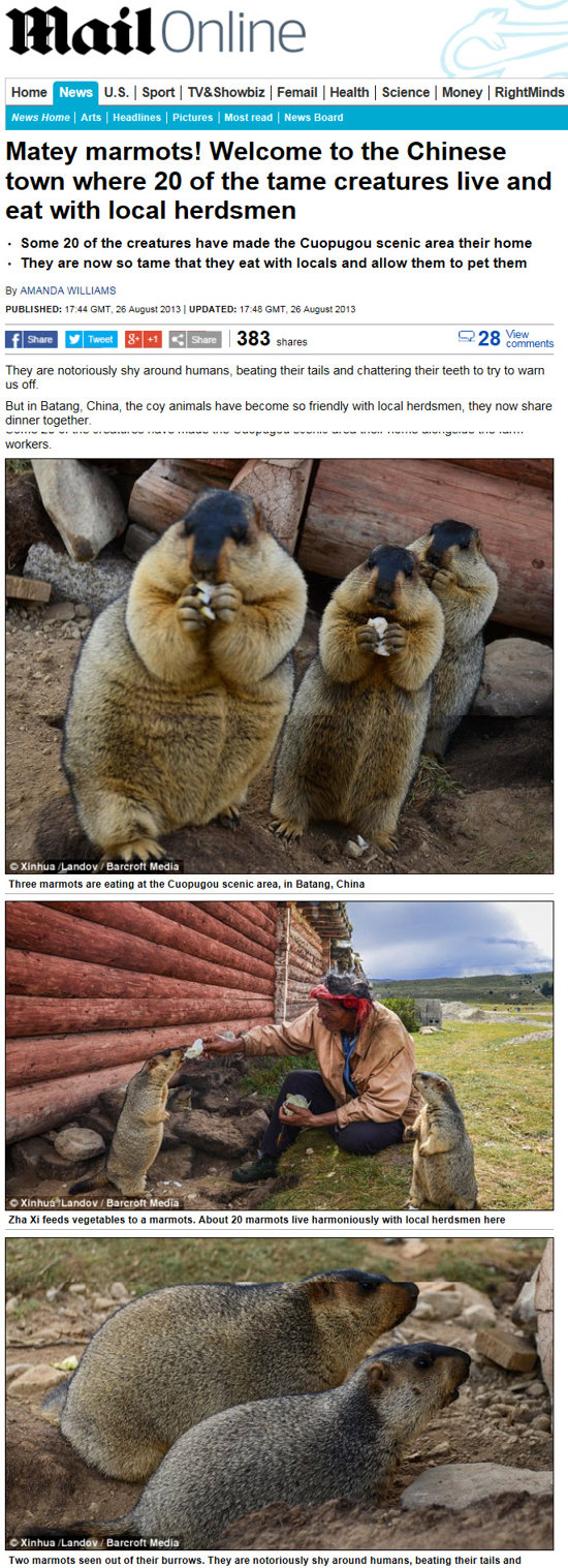野生的土撥鼠是一種對人類非常害羞的動物,當遇見陌生人、默生動物,或感覺到危險時,會甩動尾巴、發出聲音來警告同伴,不過在中國巴塘這個地方,土撥鼠卻和當地牧民相處融洽,甚至還一起共享晚餐!