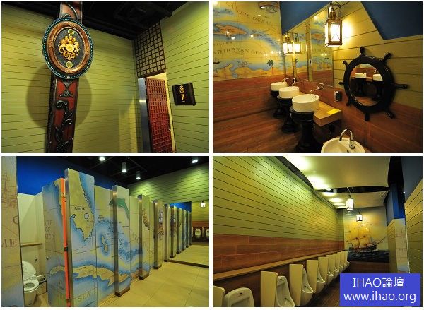 ▲像船舷一樣的牆面和廁所門上的地圖,是大航海時代的象徵。(記者田欣雲攝影)