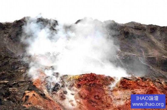 該景觀地處加拿大西北,瀕臨北冰洋的富蘭克林灣附近,這裡荒無人煙(最近的村莊距此也有65英里之遙)且海拔均超出北極圈。1826年,探險家約翰·富蘭克林至此,發現該山地下燃燒煤層源源不斷地散發出滾滾濃煙,且這裡富含褐煤、硫磺和石油頁岩。而褐煤和硫磺同處一個煤層會產生自燃現象,所以世人一致認為這裡的褐煤已燃燒了數百年。但是,煤層燃燒產生的濃煙呈高酸性,周圍湖泊均受到二氧化硫的污染,不適宜酸性成長環境的物種均被淘汰或滅絕。1850年,羅伯特·麥克盧爾探險隊來到這裡,他們採集燃燒礦物質標本要帶回去研究。出人意料的是,這些標本將船長的紅木桌子燒了一個大洞。如下圖所示,這裡的燃燒岩石及地下煤層散發出的濃煙裡所富含的化學成分為此山著色加分,留下許多明亮的條紋顏色呢。