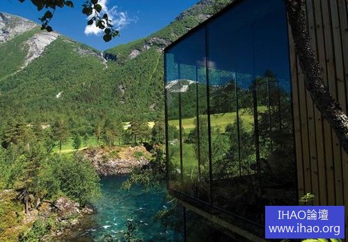 Juvet賓館採用全景觀落地窗和中世紀風格的家具,七個290平方英尺(約27平方公尺)的房間很像迷你版的菲利普‧強生的玻璃屋。所有的建築結構均由挪威著名公司Jensen & Skodvin設計,可直接眺望室外的曠野。離挪威首都奧斯陸300英裡(約483公里)的地方可供狩獵鬆雞或泛舟。賓館柔和的裝飾設計是為了襯托嘆為觀止的景色。如果你不去溫泉浴場或者供應北歐食品的餐廳,你恐怕見不到你的鄰居。
