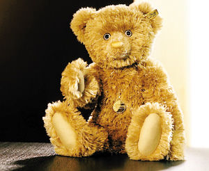 德國著名的玩具商史蒂福公司為慶祝公司成立125週年,玩具專家們精心製作出世界上首只黃金絨毛泰迪熊。熊寶寶的嘴由純金製作,毛皮是用金線縫製而成,眼睛的瞳仁用藍寶石鑲嵌而成,而虹膜則是由20枚細小的鑽石精心編織起來的。黃金絨毛泰迪熊每只售價高達8.6萬美元(約合人民幣64.6萬元)左右,全球限量銷售125只。