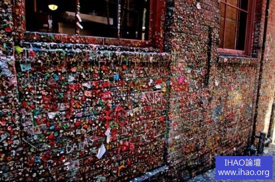 行經美國西雅圖的派克觀光市場(Pike Place Market),許多人的目光馬上就被一道全長約15公尺的五顏六色牆壁所吸引,但上前仔細一看,上頭的繽紛色彩竟是由各式各樣被嚼食過的口香糖所組成,有些甚至還被人刻意排列出文字和圖案,十分奇特。