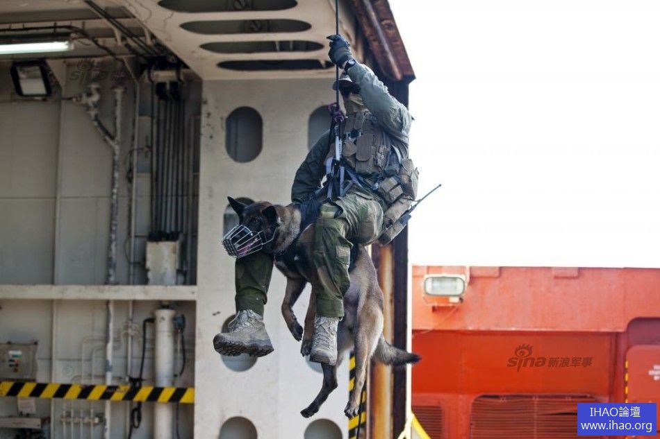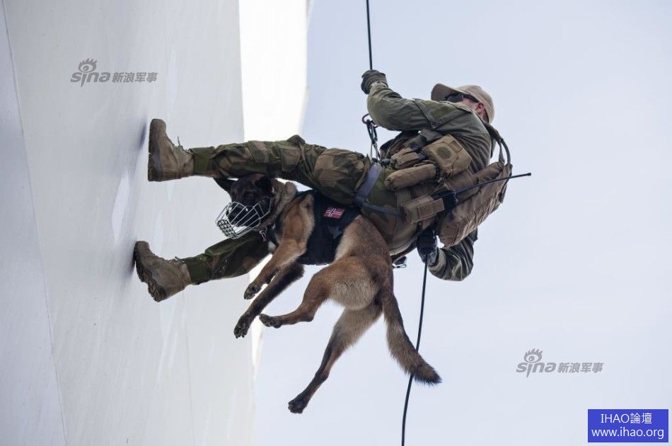 挪威特種兵攜帶軍犬進行繩降特戰課目演練