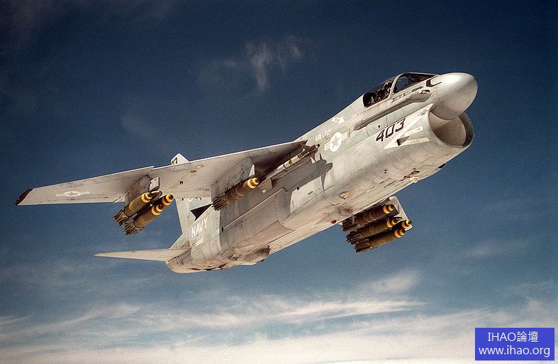 與被取代的A-4 天鷹相比,A-7A 更易維護,戰損後生存率更高。另外A-7A 的航程頗遠,可以執行A-4 鞭長莫及的任務。新飛機當然也存在問題,比如彈射起飛時吞嚥彈射器的蒸汽造成發動機推力損失,CP-781 武器釋放系統並不十分可靠。蒸汽吸入導致的推力損失問題通過改進發動機12 級壓縮機得以解決,但是CP-781 的問題解決起來難度很大。