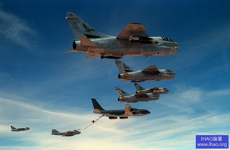 1972 年,泰國呵叻基地起飛的355 戰術戰鬥機中隊的一架A-7D 在越南上空進行空中加油