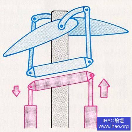 週期矩控制示意圖,注意上旋轉斜板和旋翼槳葉的連接,和下旋轉斜板受飛行員控制的可調角度