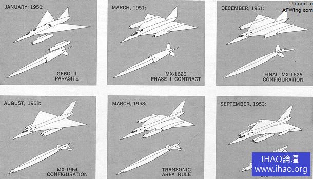 到了52 年6 月,康沃爾公司提出希望採用翼吊式的發動機佈局,發動機是兩台J75-P1、兩台J67-W-1、四台J57-P-7、四台J73 或者兩台J77。根據官方第34 號正式指令的要求,項目要使用系統的概念,裝備、武器、電子設備、各組成部分與飛機將作為一個整體進行設計,以確保可以相互配合。到了52 年中的時候,雙方的項目的進展均比較順利,符合系統的要求,而項目代號上也有了改變,MX-1626 變成了MX-1964,而波音的MX-1712 變成了所謂的MX-1965,而USAF 分別將B-58、B-59 的代號分配給了雙方(注意,這個時候B-58 選手終於正式登場了)。
