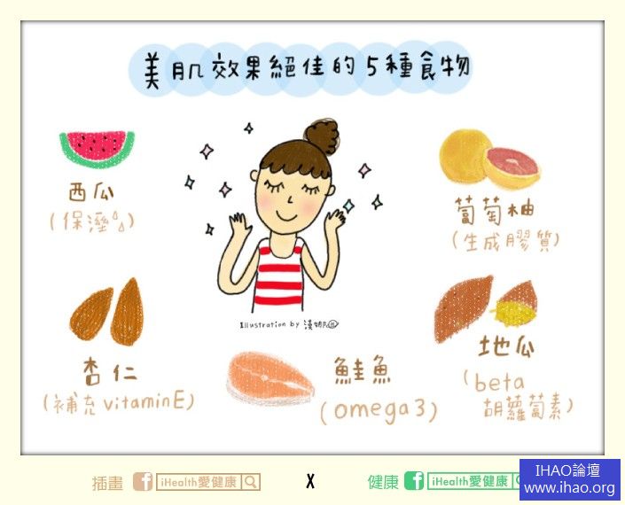 大部分深海魚類對皮膚都有好處,而鮭魚是含有Omega-3不飽和脂肪酸最高的魚類,是皮膚的組成成份,可以幫助皮膚鎖住水分,也可以抗老減少皺紋,而且這種成分只能從食物中攝取。