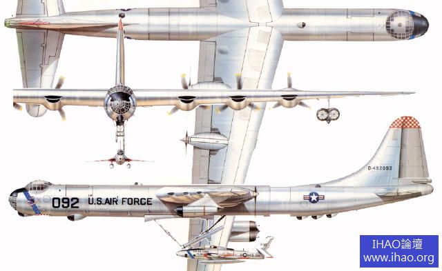 在其服役期間,康維爾公司與美國空軍還以B-36 為平台進行過一些大膽嘗試,如將2 架B-36H 改裝為核動力飛機(由於反應堆技術不過關,該方案於1958 年放棄)以及著名的“Tom-Tom”計劃(將F-84 戰鬥機直接掛在B-36 機身下發射和回收,以增強遠程轟炸機的空中防禦能力)。