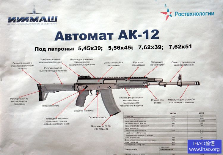 俄國伊茲瑪什公司用於宣傳AK-12 突擊步槍的海報。箭頭引出處均為該槍與AK-74 的區別之處。海報左上角為伊茲瑪什公司的標誌