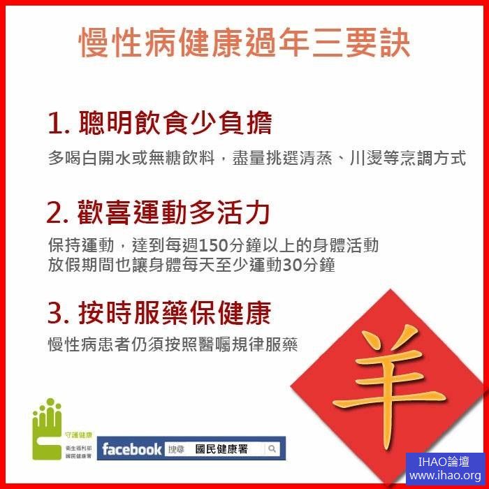 春節除了歡喜過新年外,也別忘了「聰明飲食少負擔」、「歡喜運動多活力」及「按時服藥保健康」。國民健康署祝大家 健康平安過好年。
