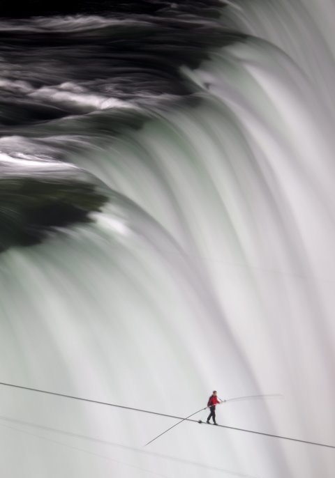 踏上距離水面60公尺的鋼索,手拉著長9公尺、18公斤重的平衡桿,僅花了25分鐘就走完長約550公尺、粗5公分的鋼索,成為百年來以走鋼索方式穿越尼加拉瓜大瀑布的第一人。