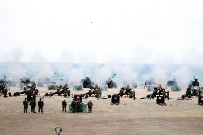 58門重砲一字排開,向海面射擊,場面壯觀,這是近年最大規模演訓。