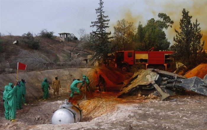 這些廢棄的地對空飛彈是2011年北約軍隊空襲這處發射場時被炸燬的,但仍然裝有毒性極強的燃料混合物。這些混合物被釋放到空氣中呈現出鮮亮的深紅色。