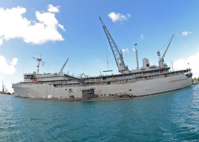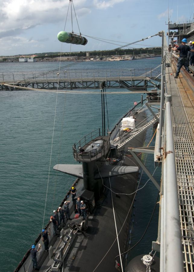 2012年11月16日,關島基地,美國海軍AS40潛艇母艦正在為奧克拉荷馬號SSN-723核子攻擊潛艇補充戰斧巡弋飛彈與MK48魚雷。
