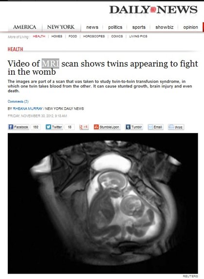據《路透社》報導,英國倫敦帝國學院以磁力共振掃描研究一種名為「雙胎輸血綜合症」的病患時,意外拍下這對雙胞胎奇妙的互動。該學院研究員稱,從來沒有這麼仔細看過雙胞胎在母親肚內的互動,可以觀察他們的胎位、活動、各佔據多少空間,以及如何將對方推走。