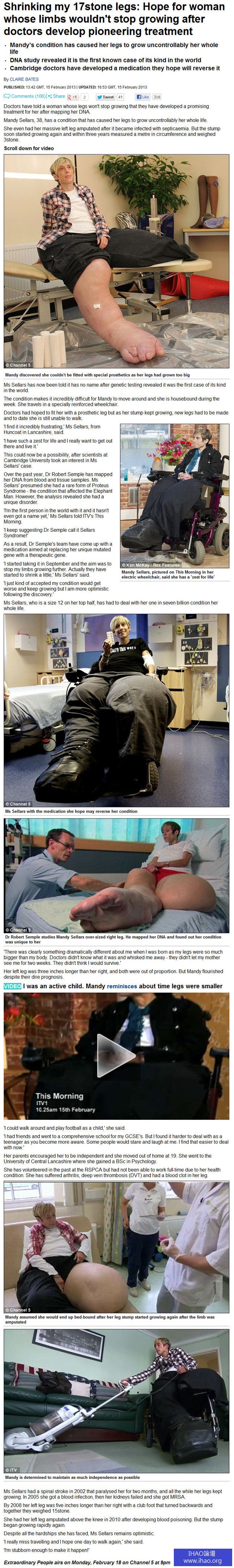 38歲的英國婦女塞勒斯出生時雙腳就明顯比身體大上許多,而且至今仍持續不斷長大,導致她只能以特製輪椅代步,她的左腿甚至在截肢後仍快速生長,兩條腿加起來重達108公斤。英國劍橋大學科學家在進行DNA研究後發現,塞勒斯的疾病可能是全球首例,目前醫師已研發出一種藥物,希望她的雙腳可以不再長大。
