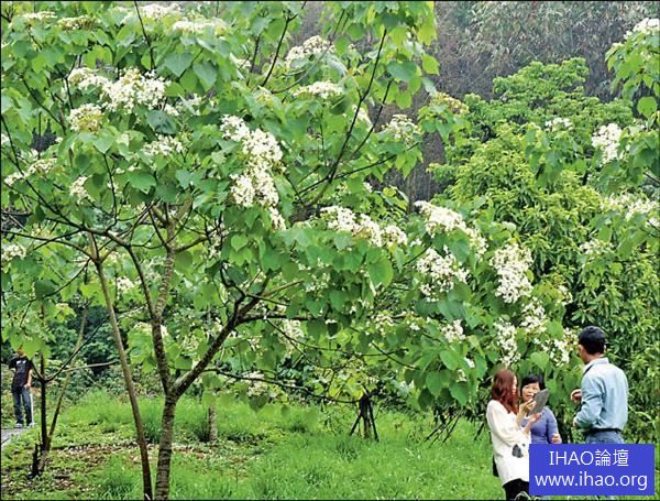 「2013雲林縣客家桐花祭—桐慶客庄.花舞102」活動昨於古坑鄉荷苞社區桐花公園登場,雖然連續幾天大雨,打落不少油桐花,但多數的油桐樹仍有八、九成花,與地上「四月雪」相暉映,賞花民眾大飽眼福。