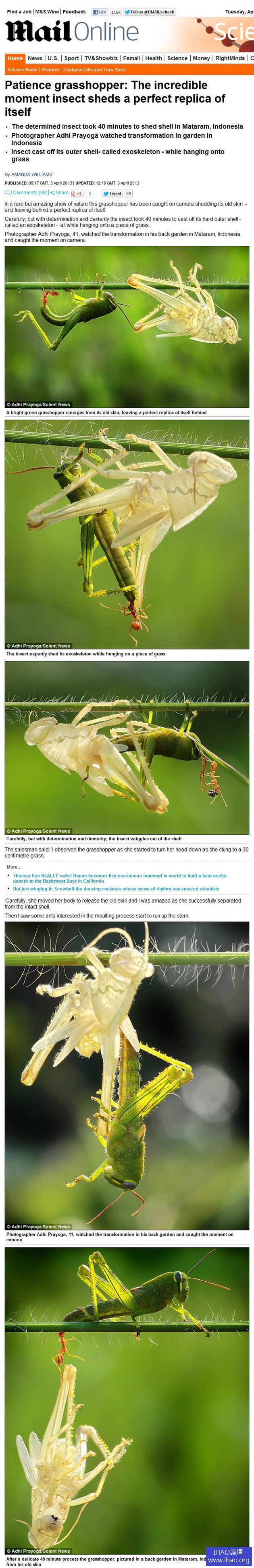 一隻鮮綠色的蚱蜢順利從它的「老皮」脫身,有如留下一個「完美的複製品」;「蛻變」可不簡單,一連串細微的動作,共花了40分鐘完成。41歲的攝影師Adhi Prayoga在印尼龍目島馬塔蘭(Mataram)自家後院,拍攝到這難得一見的景象。
