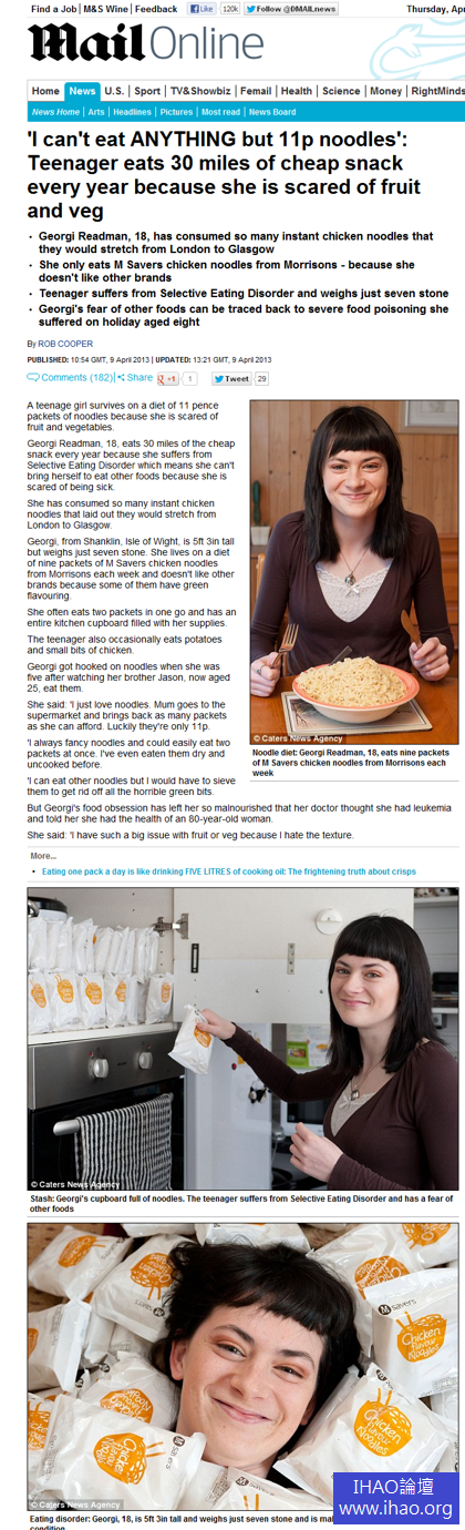 一頭黑色及肩長髮的英國18歲少女喬琪,臉上雖然帶著笑容,看似青春無敵,但實際上她卻因為十年來,吃同一款速食麵,導致身體體機能嚴重退化。英國每日郵報報導,喬琪八歲時,因為食物中毒,罹患選擇性飲食失調,害怕吃水果和蔬菜,但除了雞湯速食麵外,她偶爾加上馬鈴薯和雞肉,就這樣一吃,吃了十年,每年平均吃下的麵條長達48公里。