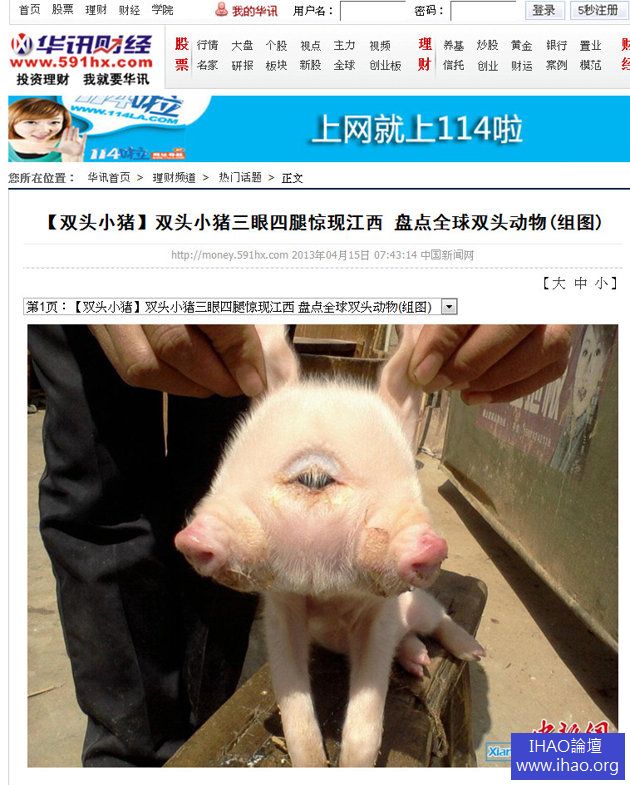 《潯陽晚報》報導,位於彭澤縣龍城鎮紅新村六組的一家養豬場,一頭母豬9日下午分娩,共產下12隻小豬,但其中一隻頭部略大,看起來是兩個頭連在一起,頭上有三隻眼睛。老闆歐陽先生指出,母豬費了近兩小時才產下這隻小豬,小豬因為頭太重前腿站不起來,後腿不斷掙扎。
