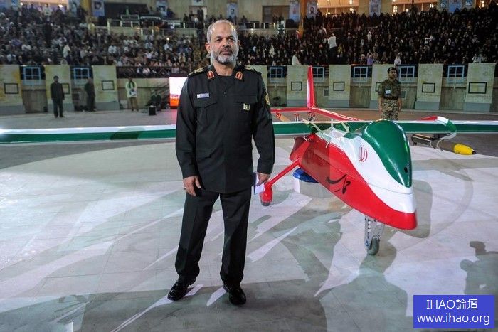 5月9日,伊朗軍方展示了一款能夠逃避雷達探測的新型無人機。該無人機代號為「史詩」(Epic)可執行監視和攻擊任務。圖為伊朗國防部長艾哈邁德·瓦希迪將軍參加該型無人機的揭幕儀式。
