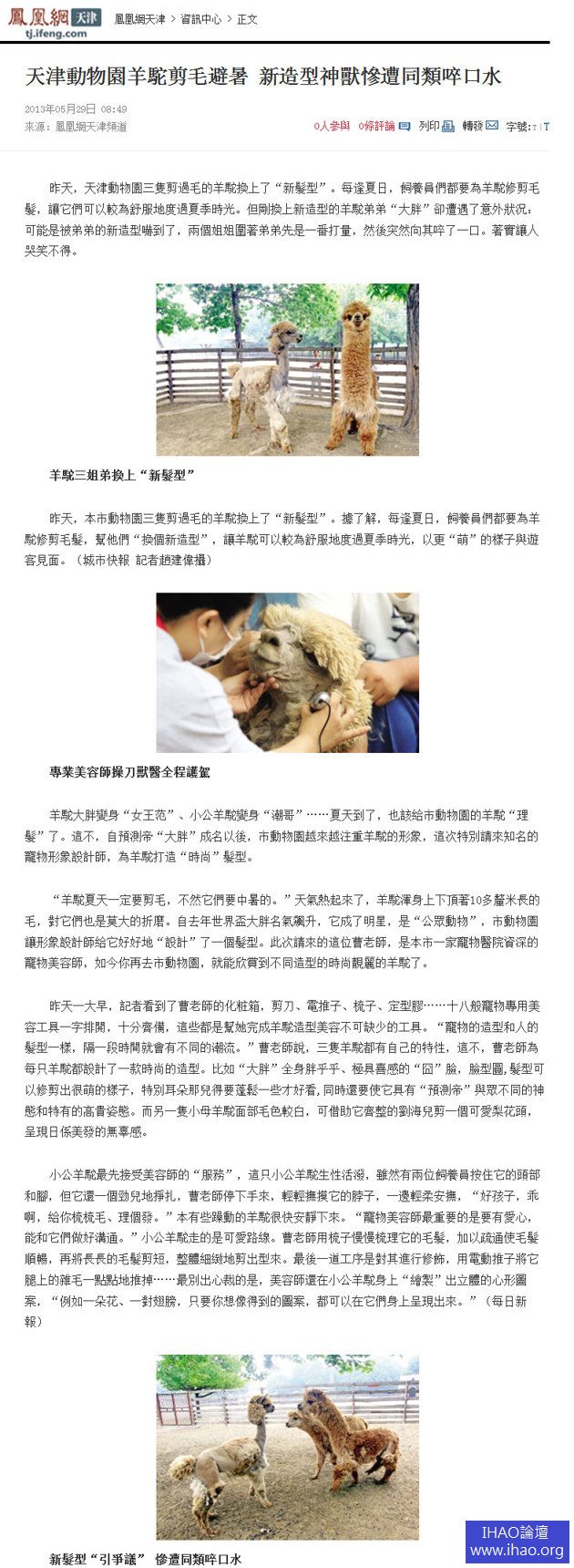 每年夏天前,天津動物園明星羊駝(又稱草泥馬)3姐弟都會剪毛避暑,而園方今年特地請來寵物美容師為牠們打造「時尚」髮型。不過,弟弟變裝後宛如「貴婦人」,把兩位姐姐嚇了一跳,姐姐在打量一番後,向牠啐一口唾液。