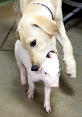 美國堪薩斯州一隻小豬被獸醫拯救後,很快跟一隻拉布拉多犬成為好朋友。當時小豬才4磅(1.8公斤),長成大豬後體重直增到300磅(約136公斤),不過「身高不是距離,體重不是問題!」這兩隻相差100多公斤的動物還是好朋友。