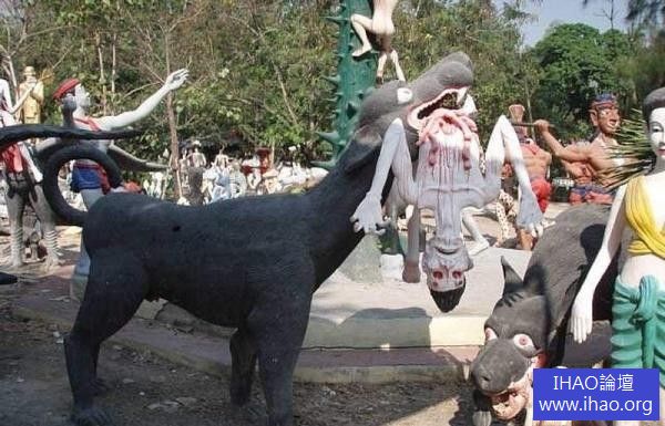據曼谷40公里處,有一座最離奇的旅遊景點——班派戎寺廟公園maleangpo“地球上的地獄”,你會看到“罪人”被魔鬼折磨的酷刑場面及許多各種恐怖的怪物雕塑,仿佛是“人間地獄”的再現。其實,這些場面都是體現佛教的“六道輪回”及惡有惡報,善有善報的報應理念,無非是通過這種直觀形象的形式勸人行善積德,廣結善緣。