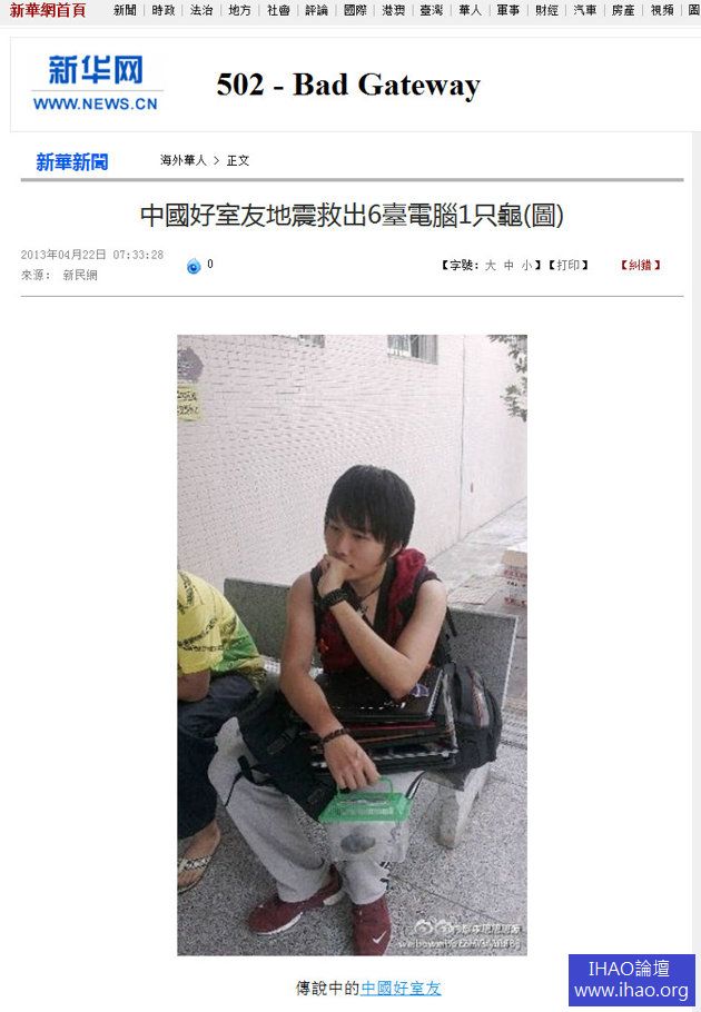 在四川雅安地震中,一位男大學生抱著6台筆電、3台相機及1隻烏龜衝出宿舍,他一個人搶救了全寢室的財產,獲讚為、「地震好室友」、「中國好室友」。不過,他表示,地震發生的第一時間已經跑宿舍,後來想到電腦裡有拍戲所收集的資料,不想心血毀於一旦,才又返回寢室。