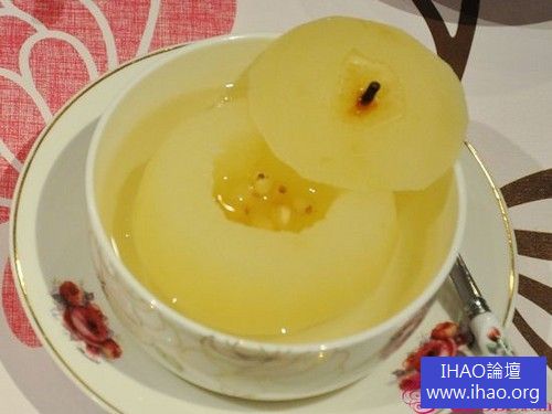 ●作法:將梨橫著切開4分之1,挖去梨中間的核,放入20粒花椒、2粒冰糖,再把切下來的蓋上去,蒸半小時左右即可食用。
