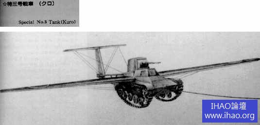 蘇聯KT-40 飛行坦克的設計思想引起了日本的極大注意。由於日本在二戰中也沒有研製出重型滑翔機,所以無法進行滑翔機機降坦克作戰。但日本裝備了數量眾多的輕型和超輕型坦克,十分適合改進為具有滑翔能力的飛行坦克。1942 年,日本開始沿用蘇聯KT-40 的思路設計出一種名為“特三號戰車”的飛行坦克。特三號戰車同樣是以輕型坦克為基礎,安裝上機翼和尾翼,組成滑翔機的外形,直接由牽引機拖曳到目標地區後,實施滑翔空降。