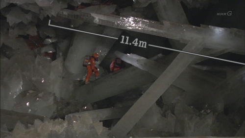 由於相當接近地下的岩漿,所以洞窟被發現時洞內溫度高達45度,而濕度更是高達將近100度,進入10分鐘就有中暑的危險,深入進入的人員還必需著上特製的冷卻服裝~另外還必須背上沈重的空氣冷卻機….所以研究團隊足足準備了一年以上才有辦法進入這神秘的奈卡結晶洞窟…