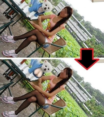 網友發揮創意,輪流惡搞照片,有的人把小白狗的眼睛放大得跟ET外星人一樣,有的則是讓牠意外露點,雖然有幾個人真的照發文者的意思把女子合成出大胸部,但其他人還是對小白狗比較有興趣啦!