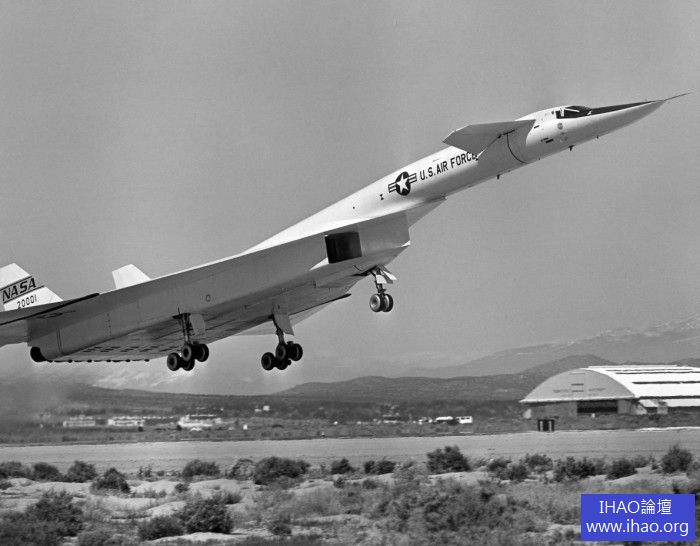 起飛中的XB-70A,注意其可變翼端呈現水平的低速飛行狀態