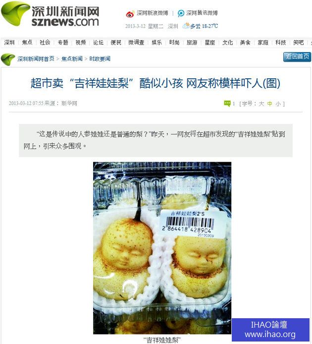 一位大陸網友把在超市發現、外形酷似小孩的「吉祥娃娃梨」照片公布在網路上,立即引發網友討論。