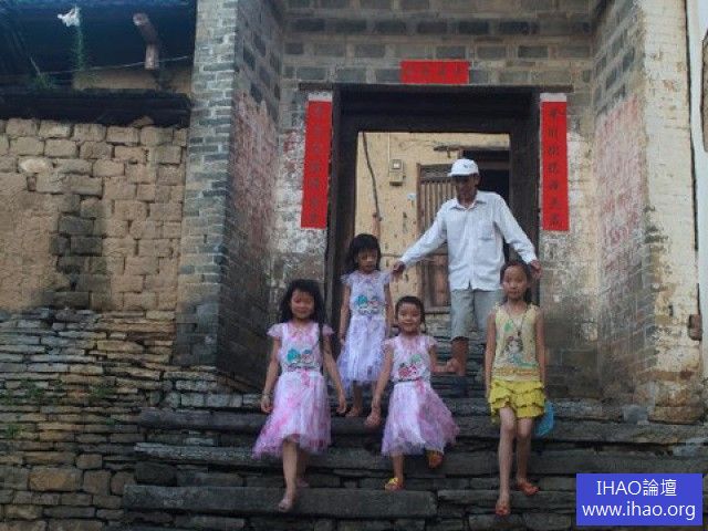 廣西融安縣東皇村一名老人帶著4名小朋友走下石階。