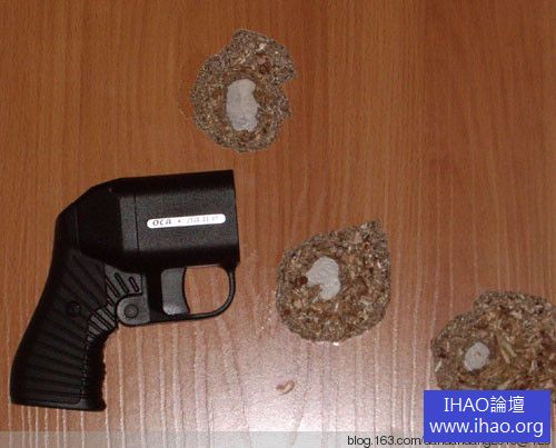 俄羅斯“ 黃蜂”PB-4-1ML 四聯發無管手槍雖然沒有槍管,但特殊的結構設計和較大的口徑還是使該槍發射的殺傷彈具有強大的動能。圖為“ 黃蜂” 和該槍近距離內射穿的聚合板