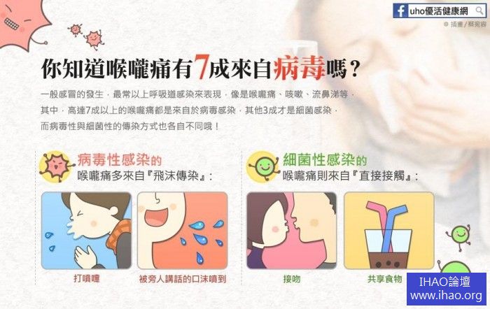很多民眾會想知道,病毒及細菌傳染的喉嚨痛有何不同?邱怡喬醫師說明,最大的不同就在於傳染的途徑,但在症狀表現上有時很難區分,病毒性感染的喉嚨痛多半靠飛沫傳染居多,如打噴嚏、被旁人講話的口沫噴到等,而細菌感染的喉嚨痛則以直接接觸感染為主,主要發生在人與人的親密接觸,常見如接吻、共享食物等引起的感染。