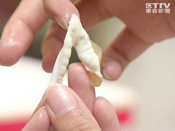 剛吃過口香糖的記者發現,放在嘴裡的精巢相當有嚼勁,吃起來QQ的,咬過的精巢和影片中喜宴上的比較看看,不管顏色或是口感都一模一樣。