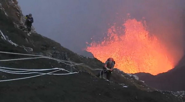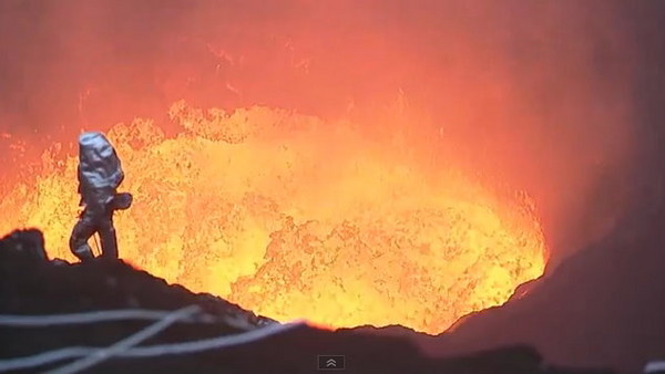 滾燙的火山岩漿不斷洶湧竄出,還發出轟隆隆的巨響,麥克利就在火山口的石頭上,岩漿高溫達到攝氏1150度,簡直是不要命了!麥克利說,「它看起來就像是太陽表面,你無法相信倒底有多熱。」