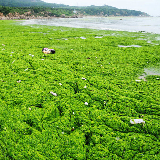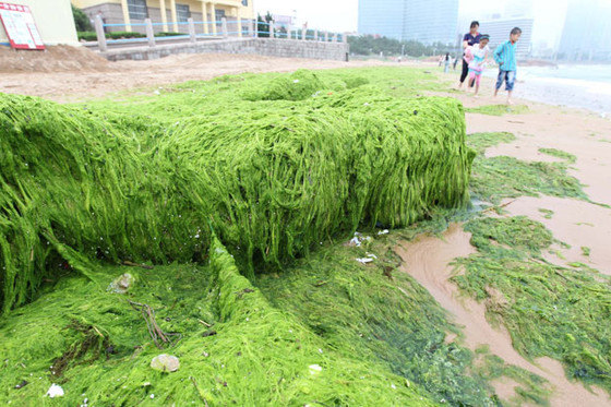 查了一下,原來因為青島沿海海水氧化太嚴重,最近四年每到了 7、8 月間,海藻猛繁潮就會突然爆發,20 天內就增加一倍面積,遍佈達 1 萬 2 千]平方公里!