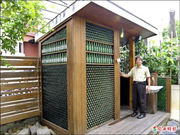 酒瓶廁所是否牢固?他說,莫拉克八八風災時,住家旁的椰子樹不堪強風吹拂倒地,還砸毀了林園警分局某主管座車,但廁所不動如山,通過考驗。