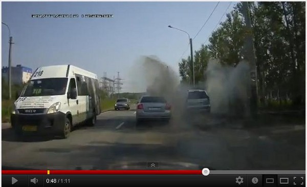 常常會有駕駛為了搶道破口大罵,甚至大打出手。俄羅斯有位休旅車駕駛也碰到霸道轎車與他爭道,他靈機一動,找了空檔順利超車後,停在一大攤積水前,等待小轎車經過,再利用休旅車的優勢,輾過泥水,讓濺起的泥水潑了轎車滿身。