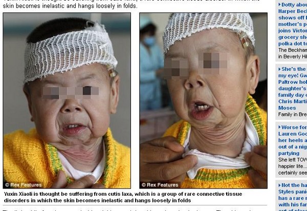 大陸1名1歲的女童玉欣(Yuxin,譯音),罹患罕見疾病「皮膚鬆垂症」 (cutis laxa),臉頰鬆垮下垂、佈滿皺紋,全身上下皮膚也都鬆弛嚴重;若只看臉,會誤以為是6、70歲的老太婆。她除了有皮膚鬆垂問題,還同時患有心臟、肺部疾病,處境讓人相當心疼。
