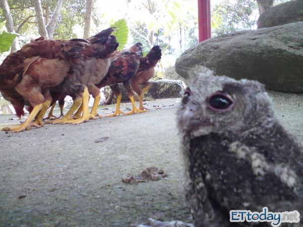 台東「野人山莊」民宿主人陳老師說,六個月前某一天,她在山莊附近走走晃晃,竟在一窩剛孵出的小雞群中發現一隻特別醜的小雞,「我捉起來一看才知道是隻貓頭鷹寶寶,之後牠跟著母雞和小雞一起覓食吃果子、吃蚯蚓,牠明明有翅膀,卻不太願意飛,每天跟著大小雞走路閒晃,我想牠應該覺得自己是隻雞吧。」