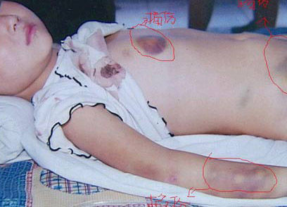 小慧身上的傷,是端午節那天去二伯家過節時被發現的,小慧外婆所在的敬老院從業人員回憶,當時小慧身上青一塊、紫一塊,全身都是傷,連坐都做不下去,兩條腿上都在流血。於是,從業人員馬上把小慧送到了她阿姨家。送到阿姨家後,小慧的鼻子、嘴巴,甚至耳朵都在流血,小便裡面也有血。看到小慧晚上疼得翻來覆去的睡不著,小慧的阿姨和姨父也難過的一晚上沒睡。第二天一大早,他們倆就起來,準備把小慧送去醫院,就在這個時候,更讓他們想不到的事情發生了,小慧突然“哇”的一下,從嘴巴裡面開始不停的瘋狂地噴血,一噴一大片,止都止不住(見圖片)。於是他們迅速撥打了120,同時打電話給在北京打工的小慧的母親陳許春。從電視裡面看到,在醫院裡也聚集了醫院從業人員和病患差不多一千多人,小丁香病床前的地上流下了大攤的血跡和擦滿血的衛生紙,(見圖片)觸目驚心,病床上雪白的褥單基本都被小丁香從口裡噴出來的鮮血染紅了,彷彿一片血海,小慧的外婆說,早上7點鐘的時候,小慧就開始吐血了。先是鼻子出血,然後就開始從喉嚨裡面涌血噴出來,(見圖片)先是大口大口的吐,後來由於輸血速度太快,被打的五內破損嚴重受不了,血開始噴涌而出,背部的六塊脊椎骨頭基本被打斷(見圖片),大小便也開始失禁。現場彌漫著悲痛的氣氛。而小慧身上簡直沒有一塊好皮膚,全都是被虐待暴力毆打形成的各種顏色的傷疤和痕跡,有手指和指甲狠命掐的,有用粗木棍子捅得幾寸深的,還有被鞋子踢的大塊的淤傷(見圖片),幾乎都在致命部位,有的在腎臟旁邊,有的直接踢到了小腹,下手之狠,讓人驚訝,暴行實在讓人發指。