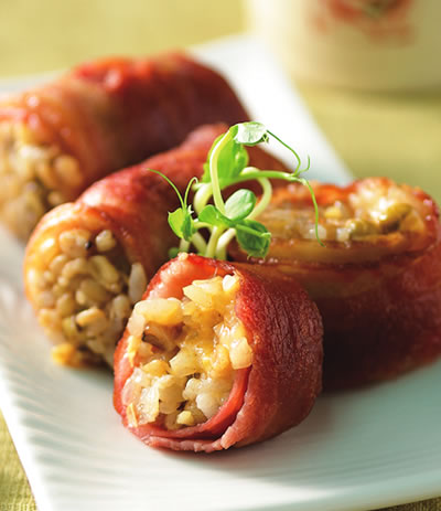 3.取一片培根片捲入作法2五榖雜糧飯,封口以少許麵糊黏緊,備用。