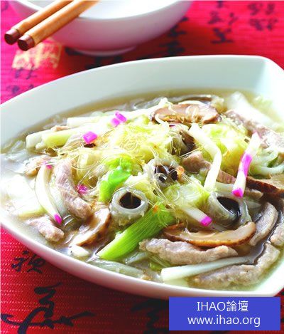4.在作法3的鍋中加入作法2的大白菜炒軟,接著加入高湯煮至滾,再放入豬肉絲、魚皮、扁魚碎煮熟。